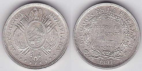 ![]() km216 50 Centavos (2010--) Estado Plurinacional de Bolivia | ![]() km151.1 1/5 Boliviano (1864-1866) | ![]() km152 1 Boliviano (1864-1869) | ||