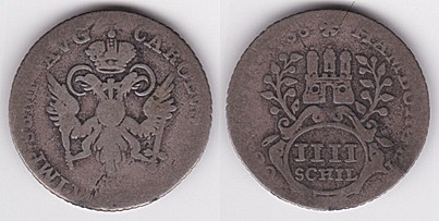 ![]() Hamburg km359.1 4 Schilling (1725-1728) | ![]() Hamburg km359.2 4 Schilling (1738) | ![]() Hamburg km530 32 Schilling (2 Mark)(1808) | ||