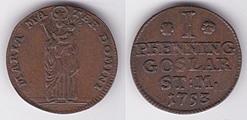 ![]() Further Austria km5 1 Heller (1783-1792) | ![]() oslar km121 1 Pfennig (1752-1760) | ![]() Hamburg km522 1 Dreiling (3 Pfenning; 1/4 Schilling; 1/128 Thaler) (1807-1809) | ||