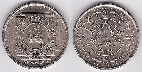 ![]() km1074.1 2 Rupees (1994-1995) | ![]() km1116 2 Rupees (1996-1997) Visit Nepal | ![]() km1170 2 Rupees (2001) 50 yrs. Of Democracy | ||