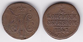 ![]() y601 5 Kopeks (1997-2009) | ![]() c157 10 Kopeks (1826-1831) | ![]() c141.1 10 Kopeks (1831-1839) | ||