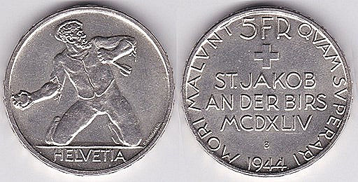 ![]() km43 5 Francs (1939) Landesausstelung | ![]() km44 5 Francs (1941) Confederation | ![]() km45 5 Francs (1944) Battle of St.Jakob 500 Ann. | ||