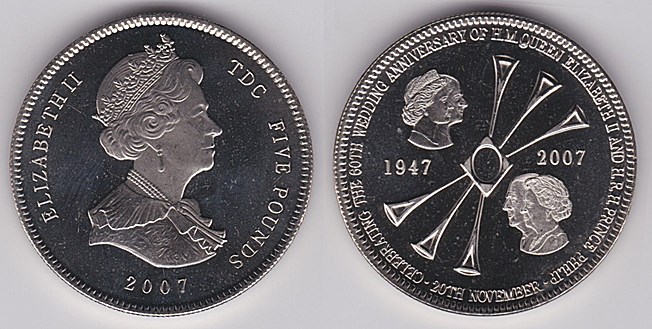 ![]() km33 25 Pence (2008) Bottlenose Dolphins | ![]() km7 50 Pence (1987) 40th Wedding Anniversary | ![]() km56 5 Pounds (2007) 60th Wedding Anniversary | ||