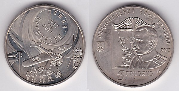 ![]() new 5 Hryvni (2013) Nesterov Loop | ![]() new 5 Hryven (2018--) standard circulation coinage | ![]() new 10 Hryven (2018) Day of the Ukrainian Volunteer | ||