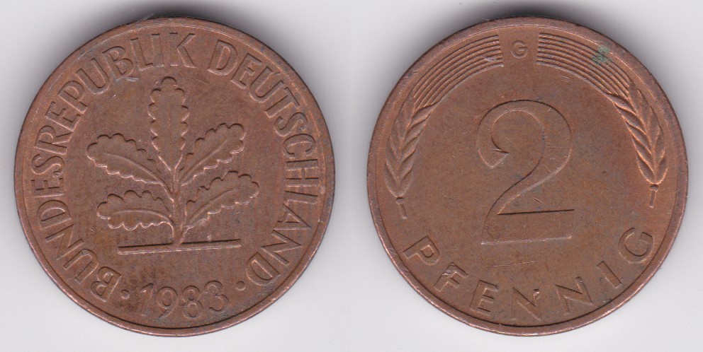 ![]() | 115593 | German Federal Republic | 1983-G | km106a | 2 Pfennig (1969-2001) | $0.25 | A |