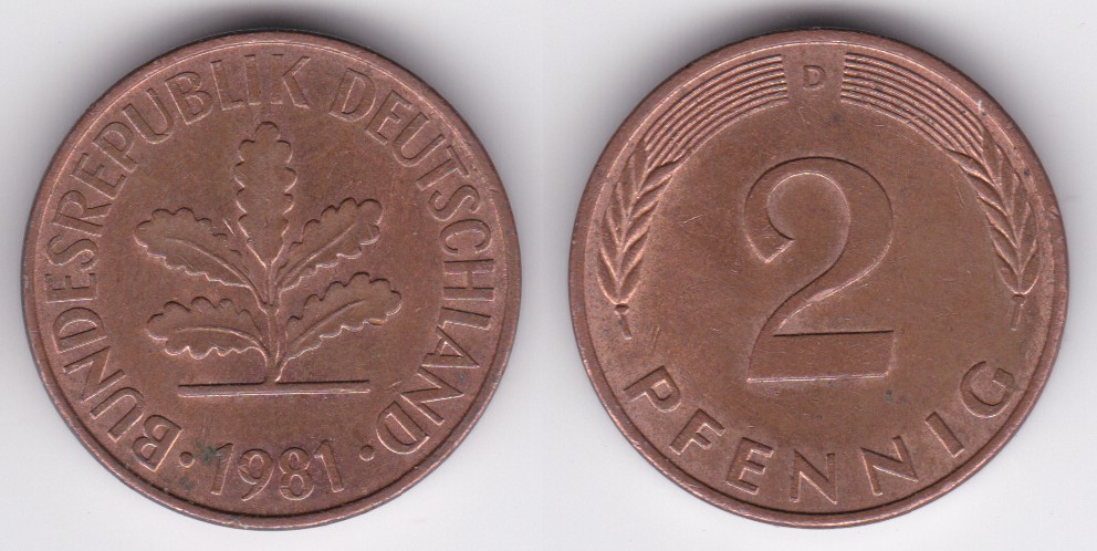 ![]() | 115595 | German Federal Republic | 1981-D | km106a | 2 Pfennig (1969-2001) | $0.25 | A |