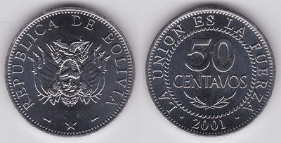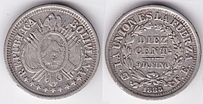 ![]() km214 10 Centavos (2010-2016) Estado Plurinacional de Bolivia | ![]() unlisted 10 Centavos (2017--) steel | ![]() km159.1 20 Centavos (1872-1907) | ||