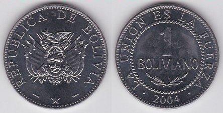 ![]() km205 1 Boliviano (1987-2008) | ![]() km217 1 Boliviano (2010--) Estado Plurinacional de Bolivia | ![]() km206.1 2 Bolivianos (1991) | ||