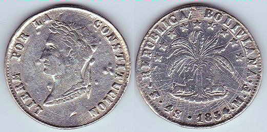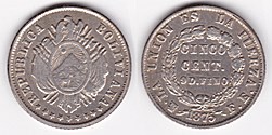 ![]() km216 50 Centavos (2010--) Estado Plurinacional de Bolivia | ![]() km151.1 1/5 Boliviano (1864-1866) | ![]() km152 1 Boliviano (1864-1869) | ||