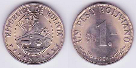 ![]() km224 5 Bolivianos (2017--) non-magnetic center disk | ![]() km186 10 Bolivianos (1951) | ![]() km191 1 Peso Bolivianos (1968) War Against Hunger | ||