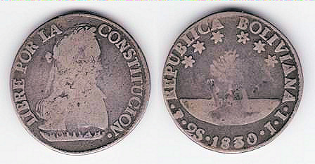 ![]() km95a 2 Soles (1830) | ![]() km135.1 2 Soles (1859-1863) | ![]() km96a 4 Soles (1830) | ||