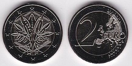 ![]() km3065 2 Euro (2022--) leaves and fruit of the oak and olive trees | ![]() km1347 5 Euro (2002) Merci le Franc | ![]() unlisted 5 Euro (2003) La Semeuse | ||