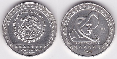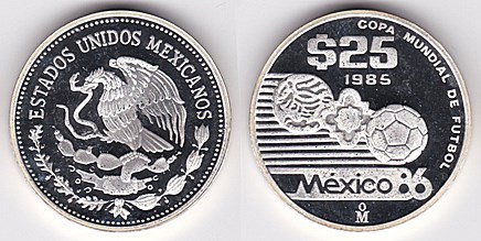 ![]() km497 25 Pesos (1985) World Cup Soccer Games Mexico 1986 | ![]() km503 25 Pesos (1985) World Cup Soccer | ![]() km554 25 Pesos (1992) Eagle Warior | ||