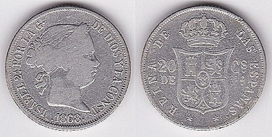 ![]() km7 1 Quarto (1817-1833) quarter real | ![]() km148 10 Centimos (1880-1885) | ![]() km146 20 Centimos (1864-1868) | ||