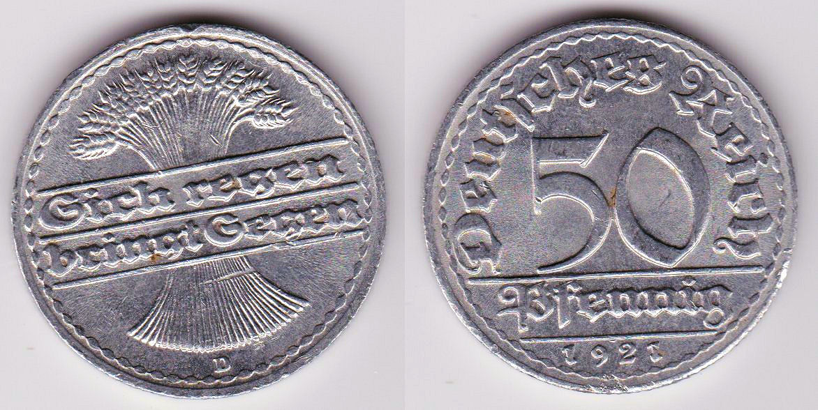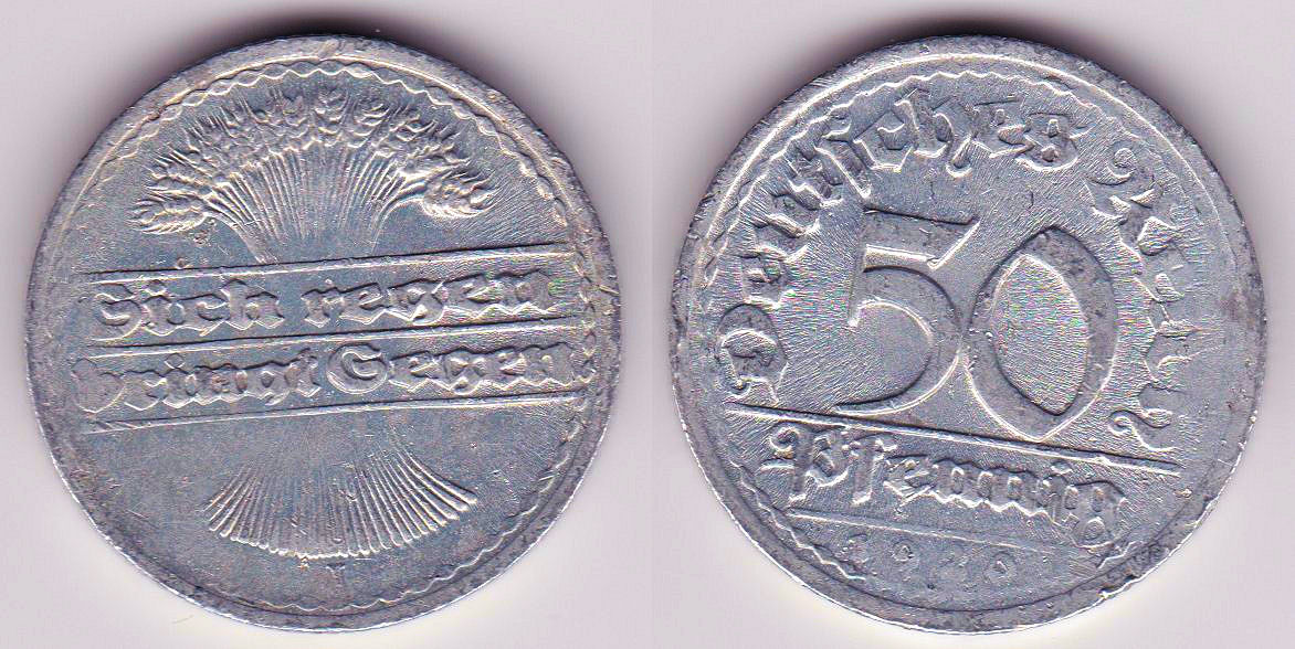 ![]() | 104236 | German Weimar Republic | 1920-J | km27 | 50 Pfennig (1919-1922) | $1.75 | A |