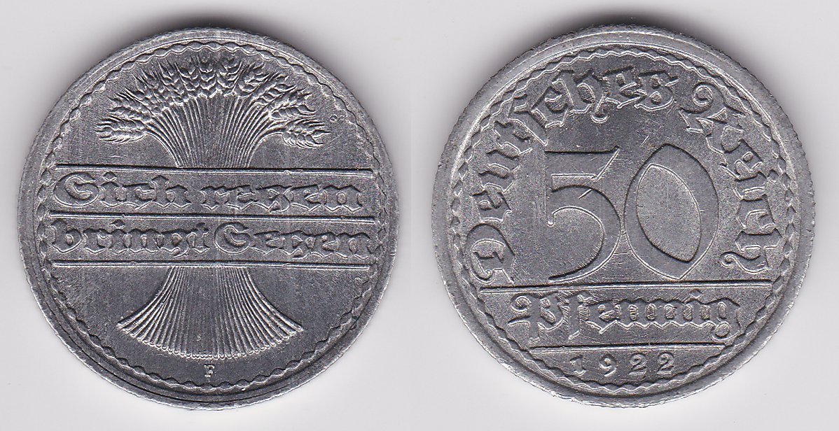 ![]() | 69722 | German Weimar Republic | 1922-F | km27 | 50 Pfennig (1919-1922) | $0.75 | A |