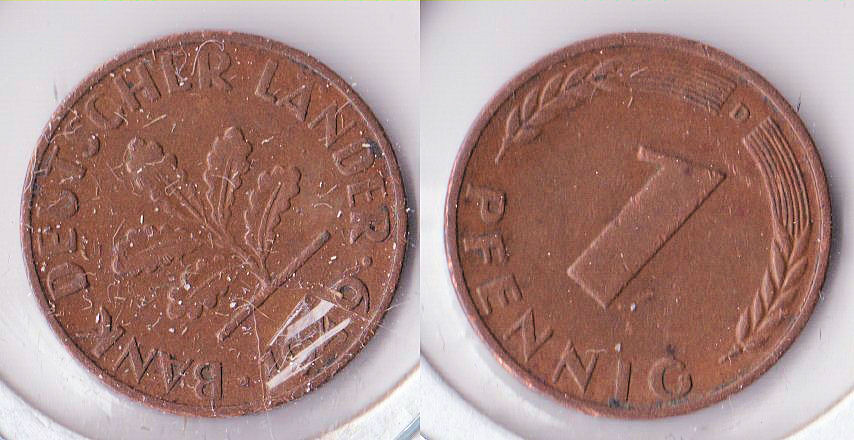 ![]() | 77522 | German Federal Republic | 1948-G | kma101 | 1 Pfennig (1948-1949) (2 available) | $1.50 | A |