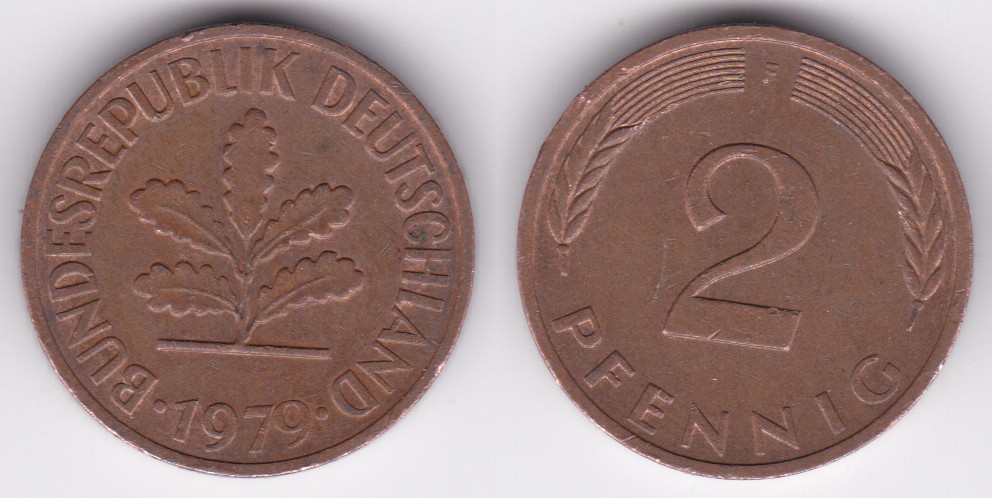 ![]() | 115596 | German Federal Republic | 1979-F | km106a | 2 Pfennig (1969-2001) (2 available) | $0.25 | A |