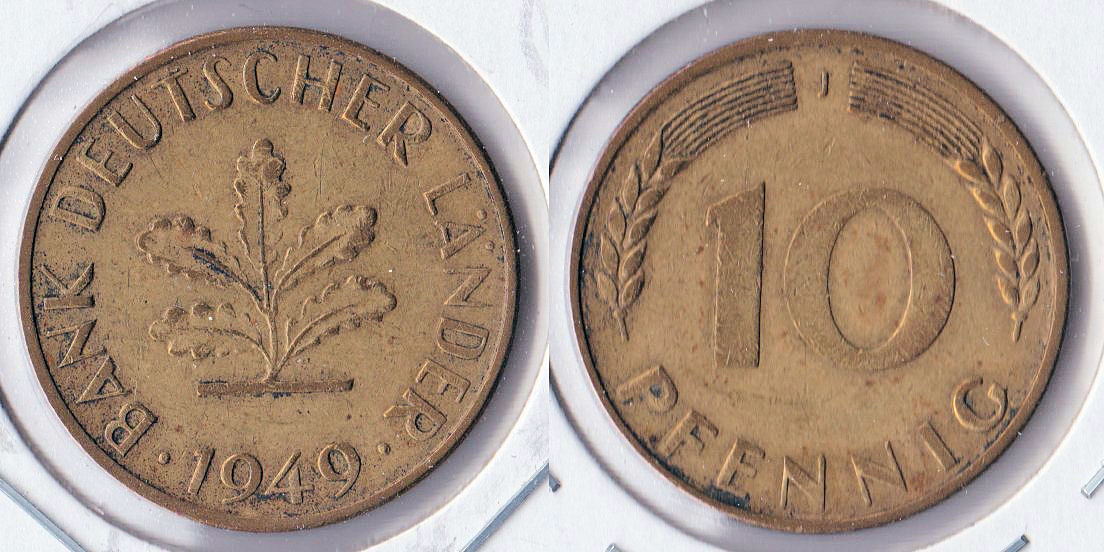 ![]() | 77630 | German Federal Republic | 1949-J | km103 | 10 Pfennig (1949) | $1.25 | A |