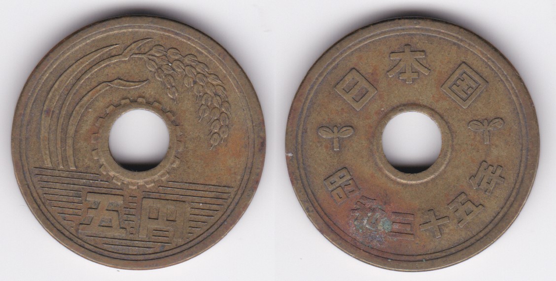 | 108909 | Japan | 1975 | y72a | 5 Yen (1959-1989) new script | $0.25 | A |
