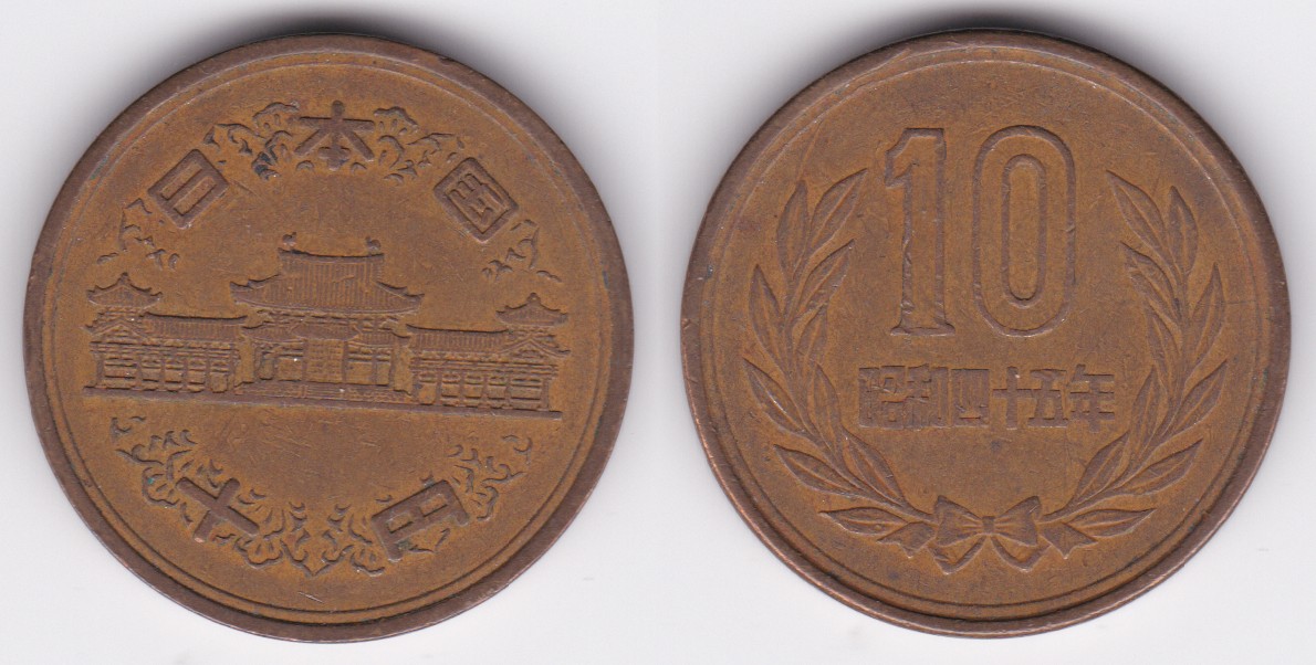 ![]() | 113195 | Japan | 1970 | y73a | 10 Yen (1959-1988) plain edge | $0.25 | A |