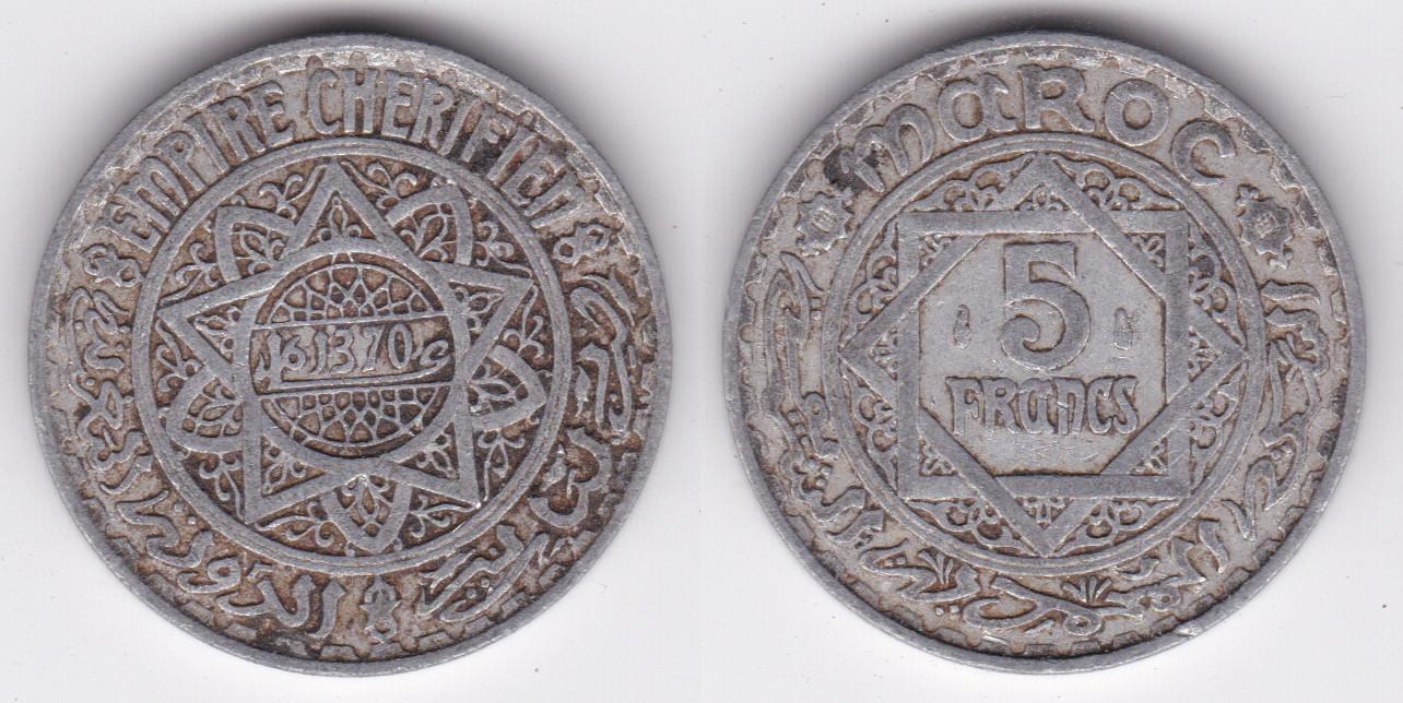 ![]() | 53115 | French Morocco | AH1370 | y48 | 5 Francs (AH1370) | $3.00 | B |