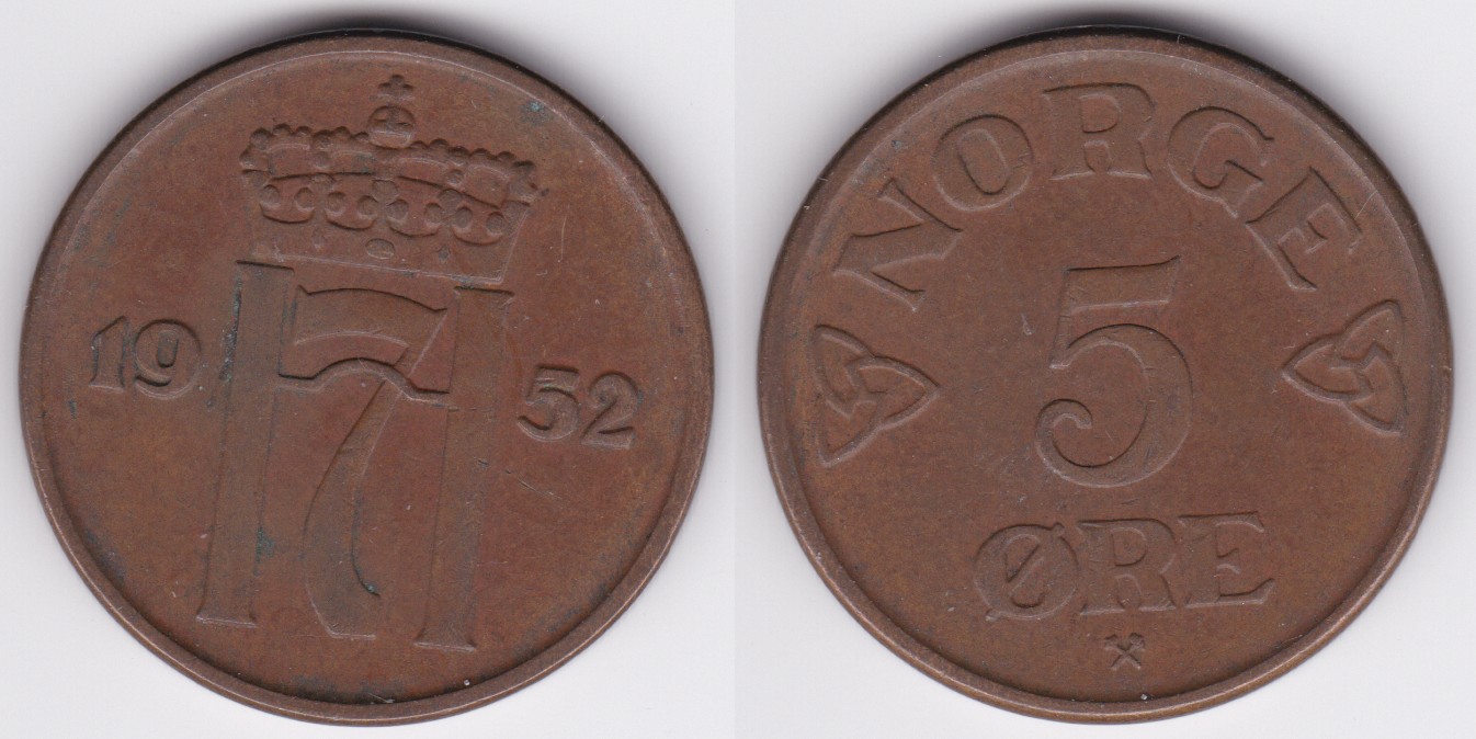 ![]() | 110205 | Norway | 1952 | km400 | 5 Ore (1952-1957) | $0.25 | A |