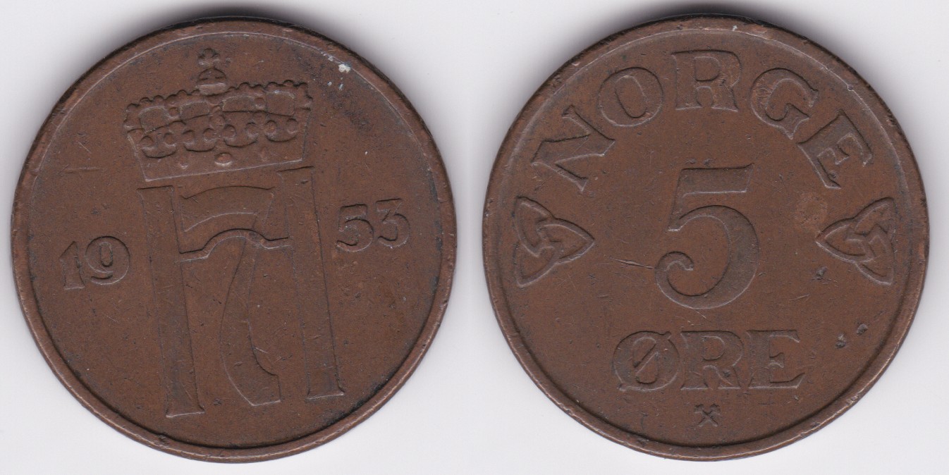 ![]() | 114296 | Norway | 1953 | km400 | 5 Ore (1952-1957) | $0.50 | A |