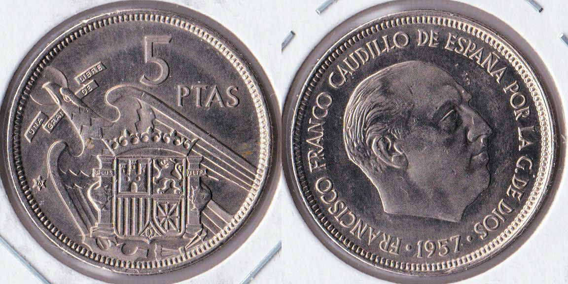 ![]() | 110803 | Spain | 1957 | km786 | 5 Pesetas (58-75) 1957 Dictadura | $0.25 | A |